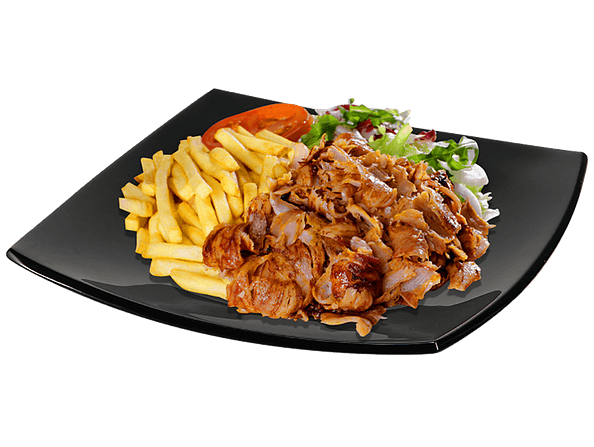 Kebab de poulet, salade, tomates, oignons, frites, sauce au choix
